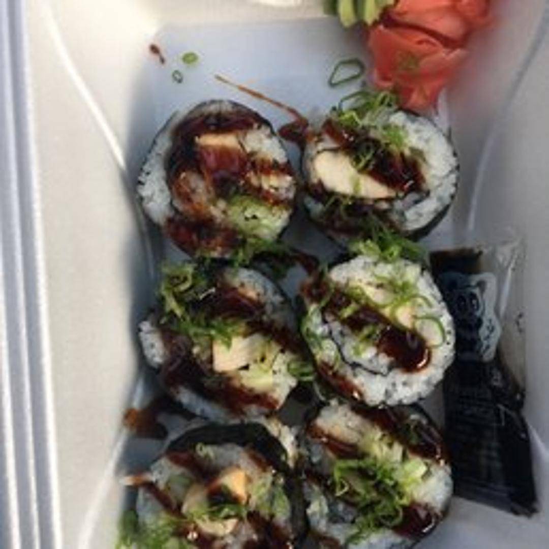 A popular and flavorful sushi roll featuring tender pieces of grilled chicken coated in a rich, sweet, and savory teriyaki glaze, expertly rolled with fresh sushi rice and crisp nori, often complemented by fresh vegetables like cucumber or avocado for a delightful texture and taste.