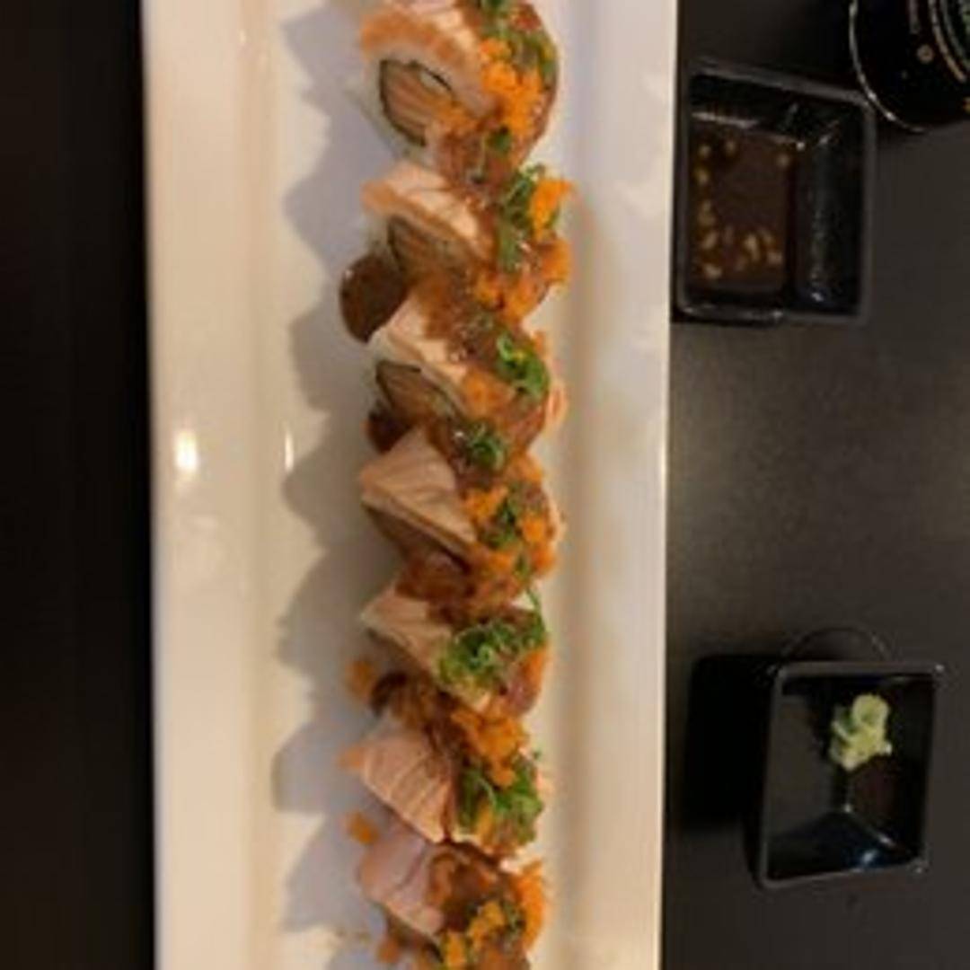 A dynamic and flavorful sushi roll featuring crispy shrimp tempura, fresh avocado, and crisp cucumber, elegantly topped with delicate slices of seared salmon and a drizzle of our signature sweet eel sauce, creating a delightful balance of textures and savory notes.