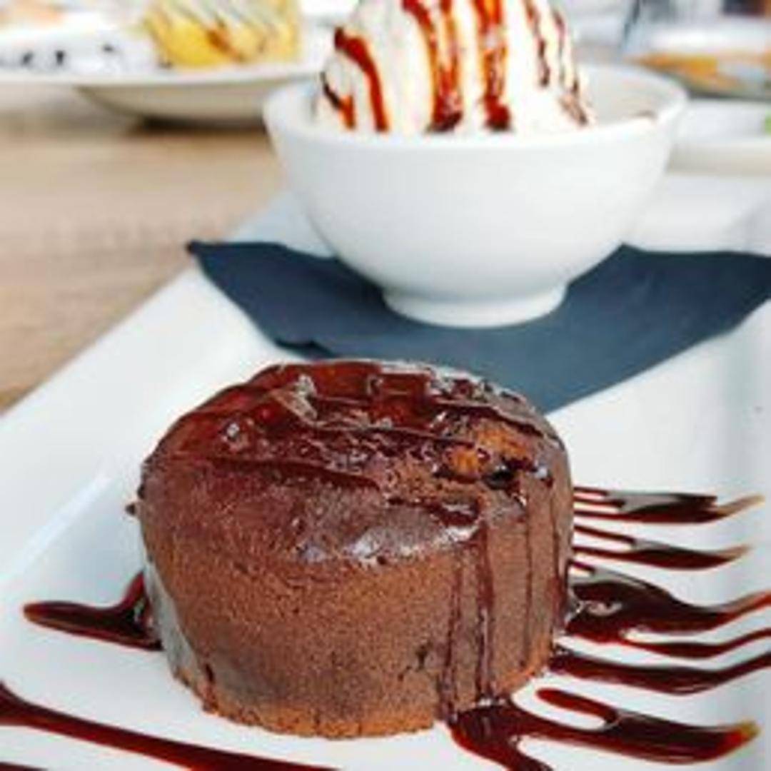 A decadent warm chocolate cake with a rich, molten chocolate center that flows effortlessly with every spoonful. Dusted with a delicate veil of powdered sugar and served alongside a scoop of premium vanilla bean ice cream, it's the perfect indulgent finale to your dining experience.