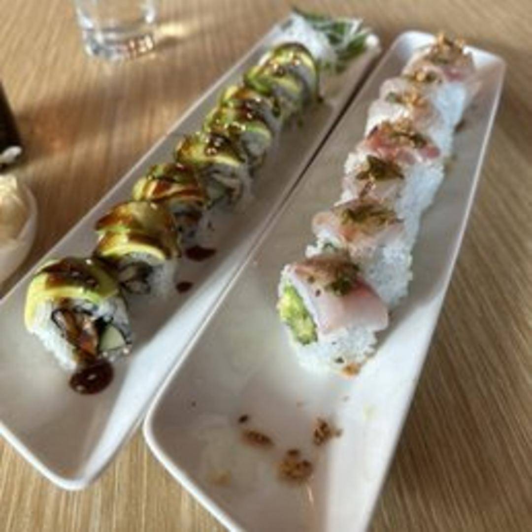 A popular sushi roll featuring shrimp tempura, cucumber, and topped with avocado and eel sauce.