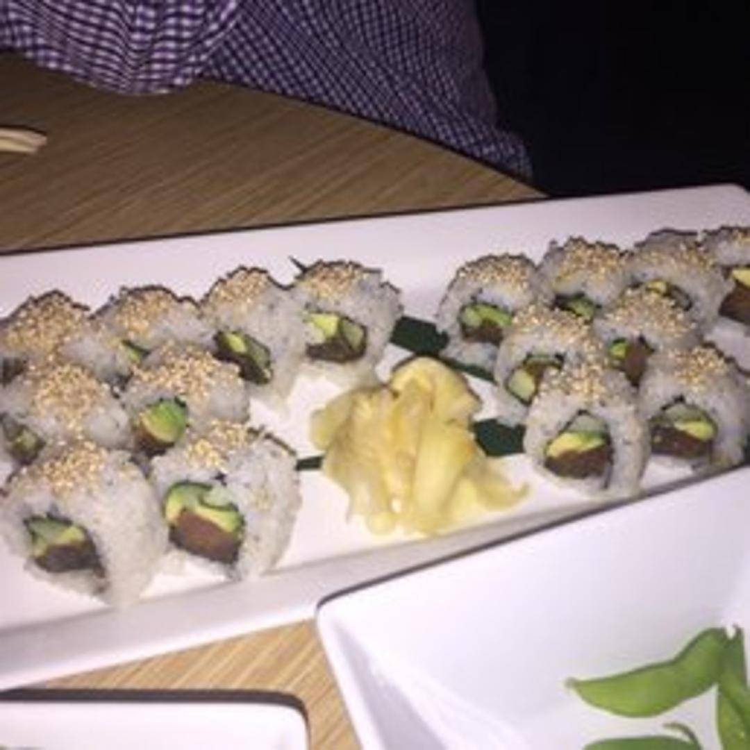 Sushi roll featuring seasoned raw fish (often tuna or salmon), seaweed salad, avocado, and a spicy sauce.