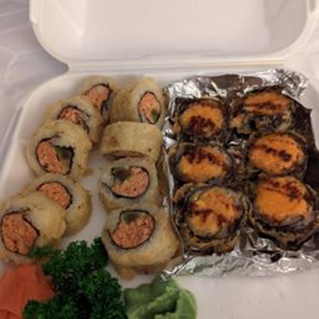 A baked or torched sushi roll, often featuring a California roll base topped with a creamy seafood mixture (such as scallops, crab, or shrimp) and drizzled with eel sauce and spicy mayo. The 'volcano' effect is created by the bubbling and browning of the topping.