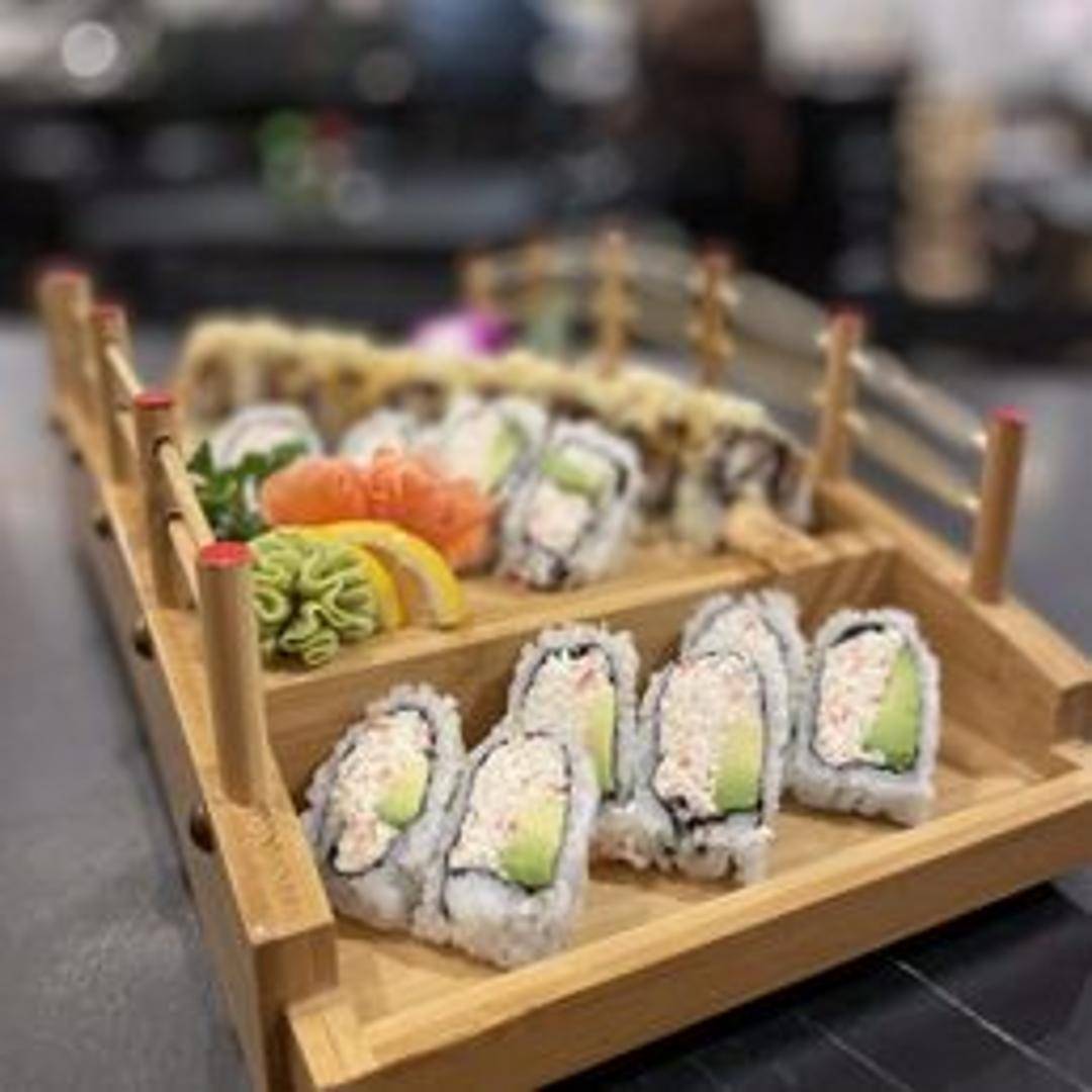 A popular sushi roll featuring imitation crab meat, avocado, and cucumber wrapped in seasoned sushi rice and nori seaweed. Often coated with sesame seeds or tobiko (flying fish roe).