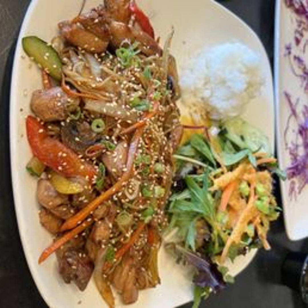 Stir-fried wheat noodles with vegetables (such as cabbage, carrots, and onions) and a savory yakisoba sauce. May include protein such as chicken, pork, or shrimp.