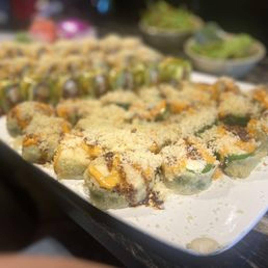 A deep-fried roll, typically featuring spicy tuna, cream cheese, and jalapeño, creating a rich and intense flavor. Drizzled with spicy mayo and eel sauce.