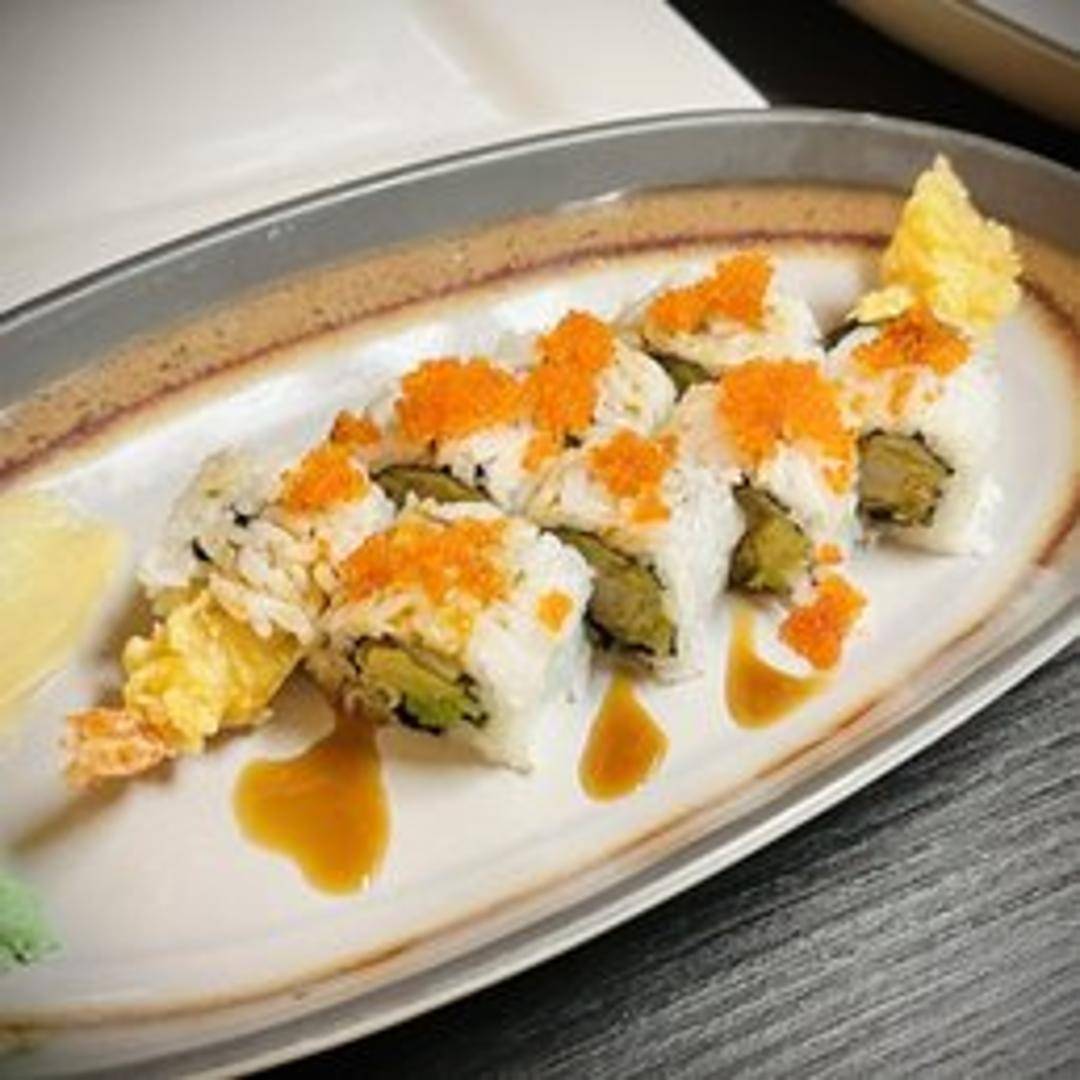A sushi roll featuring crispy fried shrimp tempura. Typically includes avocado, cucumber, and a sweet and savory sauce like eel sauce. Rolled in seaweed and rice.