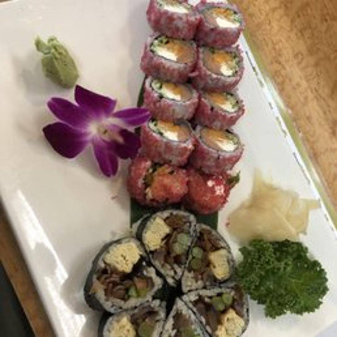 A signature creation inspired by our home, the Arlington Roll is a masterful blend of crispy shrimp tempura, spicy tuna, and fresh avocado, topped with a delicate layer of seared salmon and finished with a drizzle of sweet eel sauce and spicy mayo. A local favorite, crafted with passion and bold flavors.