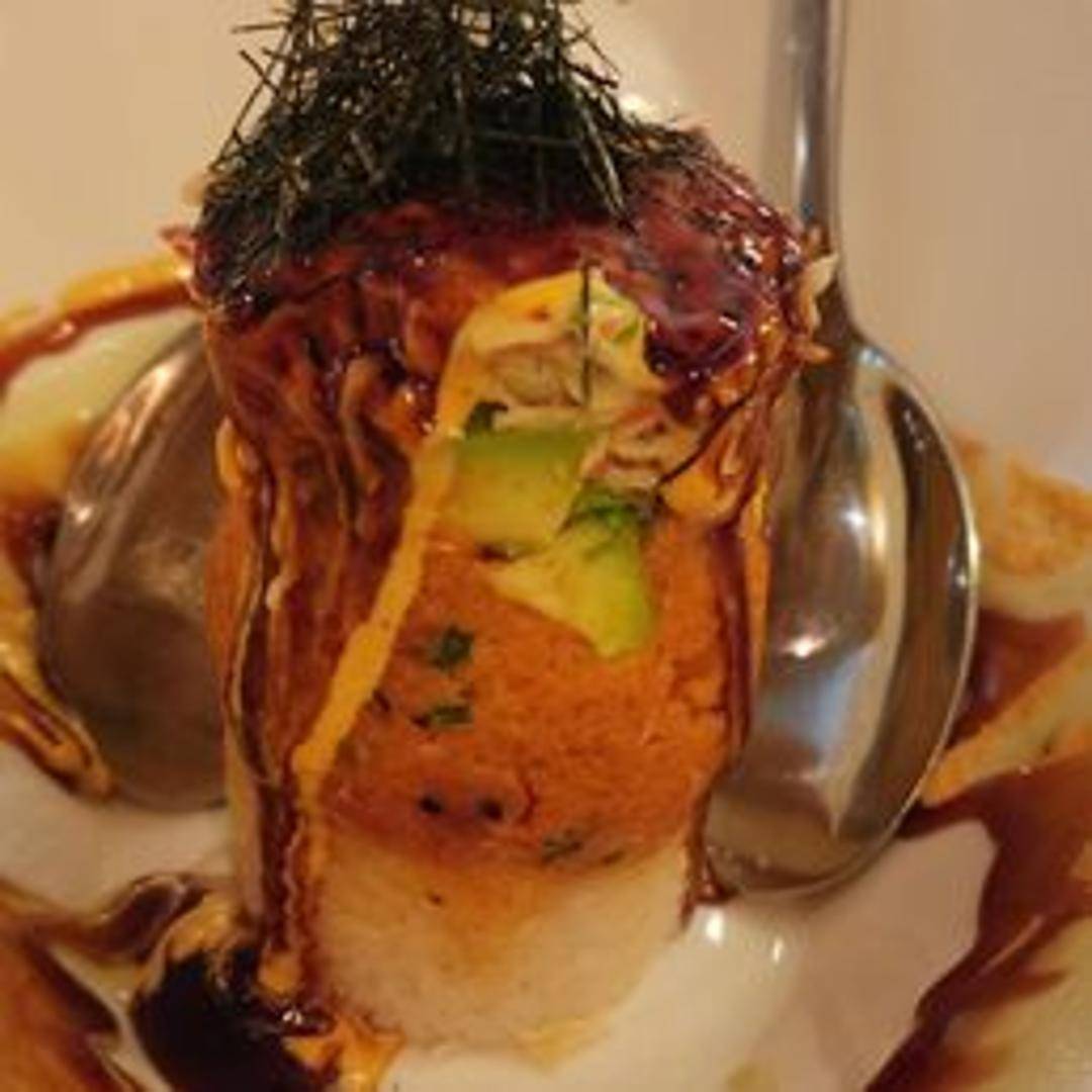 A layered presentation of diced Ahi tuna, avocado, rice (often sushi rice), and sometimes other ingredients like seaweed salad or sauces. Presents a combination of textures and flavors, including fresh tuna, creamy avocado, and savory elements.