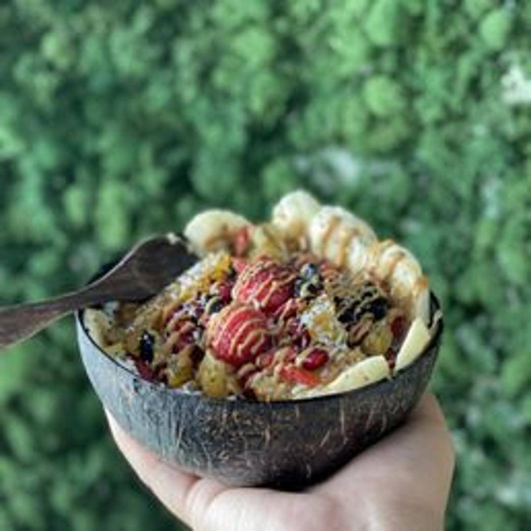 A blended base of organic acai berries, topped with granola, fresh seasonal fruits (such as bananas, berries, and kiwi), shredded coconut, and a drizzle of honey. Can be customized with additional toppings.