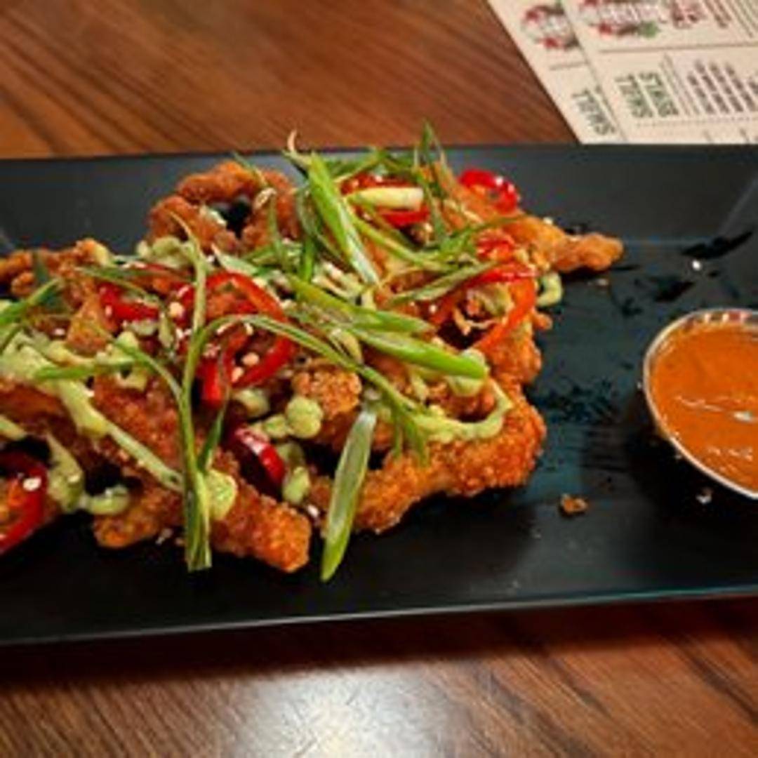 Crispy, golden-brown calamari rings served with a side of spicy aioli and a sweet chili dipping sauce. A perfect appetizer to share, offering a delightful combination of textures and flavors with a subtle island twist.