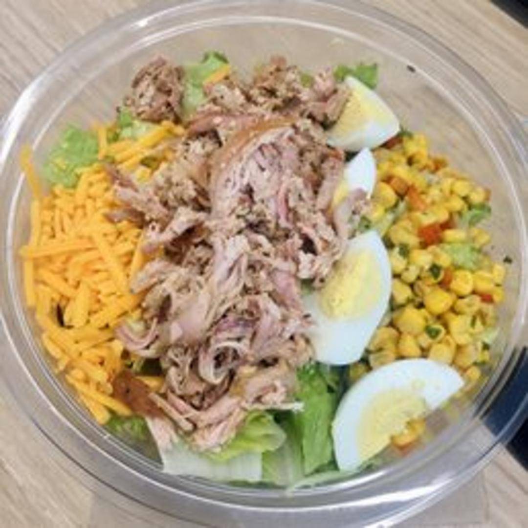 A vibrant and hearty classic, featuring a crisp bed of fresh mixed greens generously topped with rows of tender smoked chicken or turkey, crumbled crispy bacon, slices of ripe avocado, juicy grape tomatoes, hard-boiled egg quarters, and sharp blue cheese crumbles. Finished with a choice of dressing, this salad offers a harmonious blend of textures and flavors.