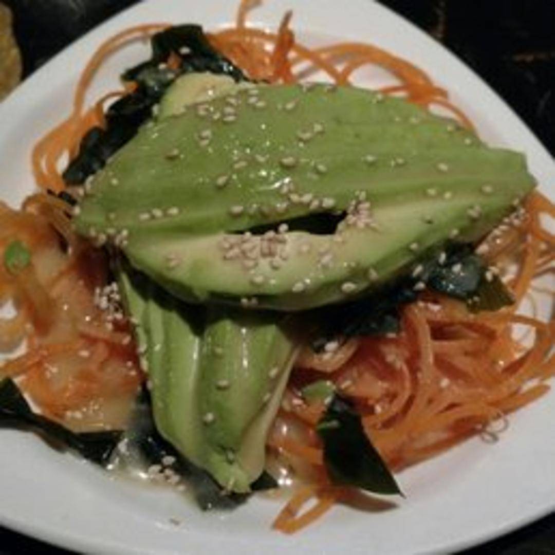 A refreshing and healthy salad centered around generous slices of ripe, creamy avocado. It is beautifully presented over a bed of crisp, fresh mixed greens, often complemented by juicy cherry tomatoes, and dressed with a light, flavorful ginger or house dressing that enhances its natural taste.