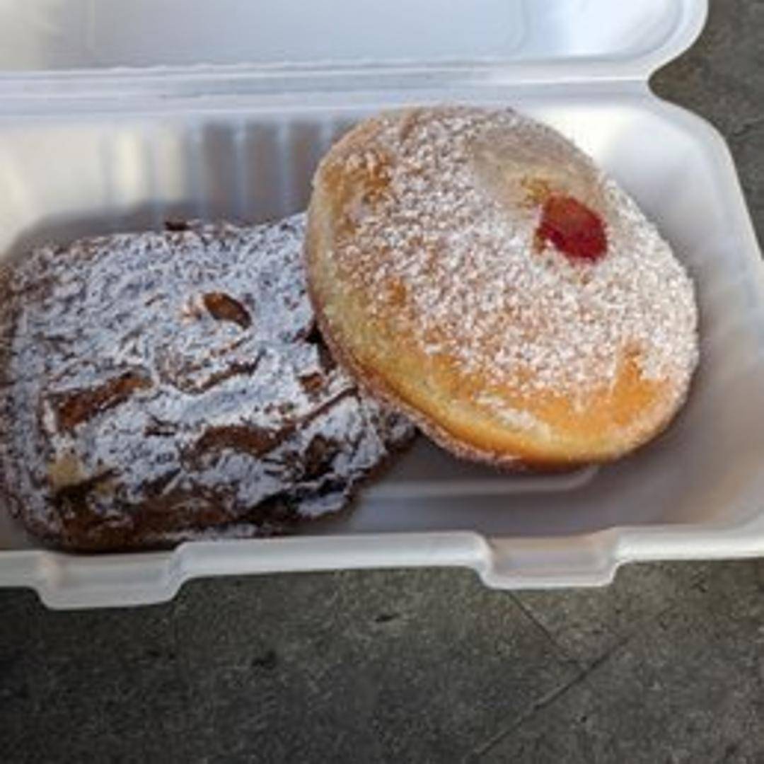 A light and airy, deep-fried pastry filled with a sweet and tart raspberry jam. Generously dusted with powdered sugar for a perfect balance of flavors and textures.