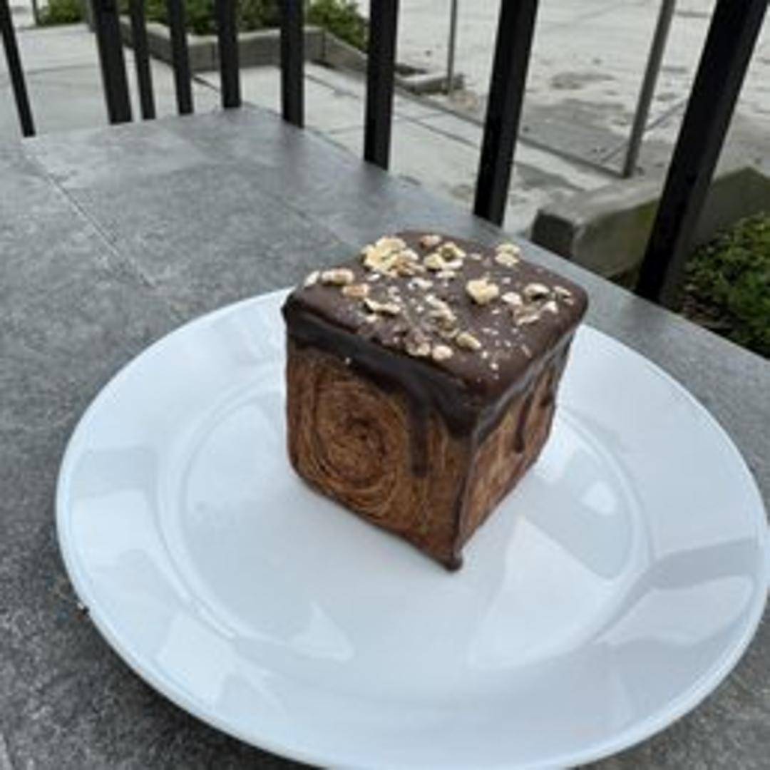 A buttery and flaky croissant filled with a rich almond paste and chunks of dark chocolate. Topped with sliced almonds and a dusting of powdered sugar for a nutty and chocolatey delight.