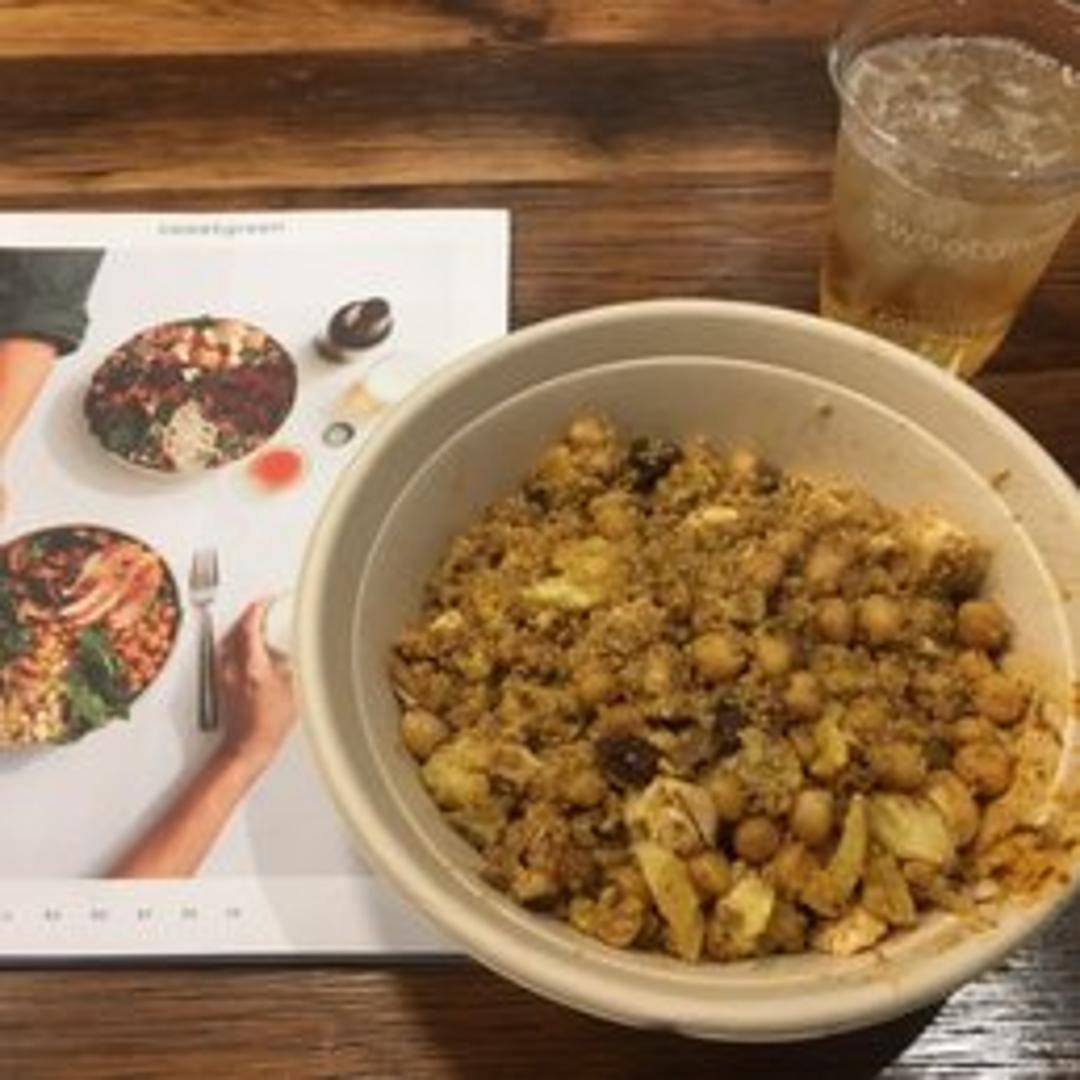 Organic arugula, warm quinoa, curry roasted cauliflower, roasted sweet potatoes, toasted almonds, organic raisins, shredded kale, curry cashew vinaigrette. Contains nuts.
