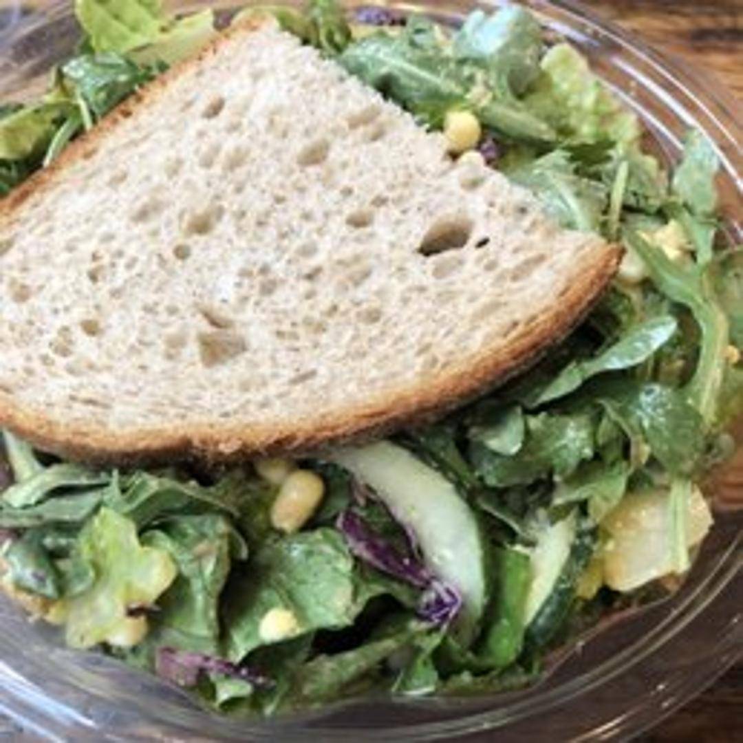 Organic arugula, shredded cabbage, organic carrots, cucumbers, sprouts, toasted almonds, spicy sunflower seeds, shredded kale, cilantro, spicy thai dressing. Contains nuts.