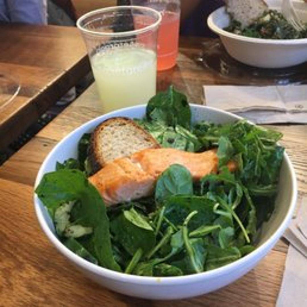 Organic baby spinach, shredded kale, quinoa, roasted sweet potatoes, apples, roasted almonds, raisins, and goat cheese. Served with balsamic vinaigrette.