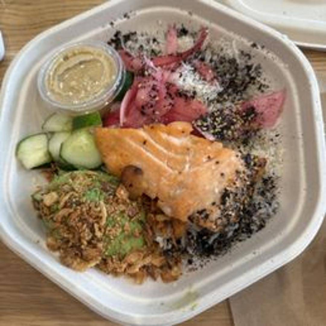 Warm quinoa, baby spinach, shredded kale, roasted sweet potatoes, spicy broccoli, toasted sesame seeds, miso glazed salmon, miso sesame ginger dressing.