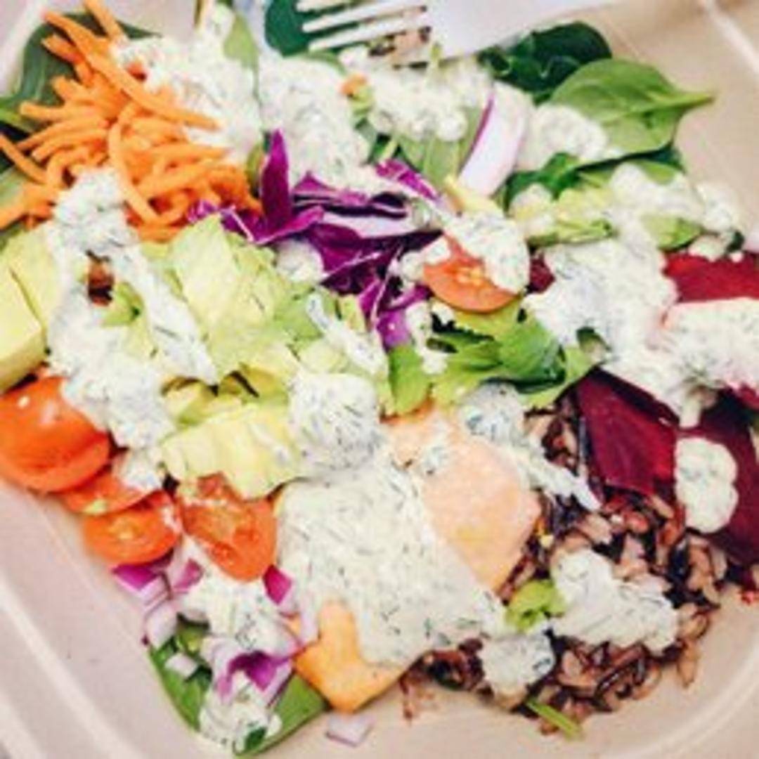 Organic baby spinach, shredded kale, raw carrots, cucumbers, broccoli, chickpeas, avocado, green goddess ranch dressing.