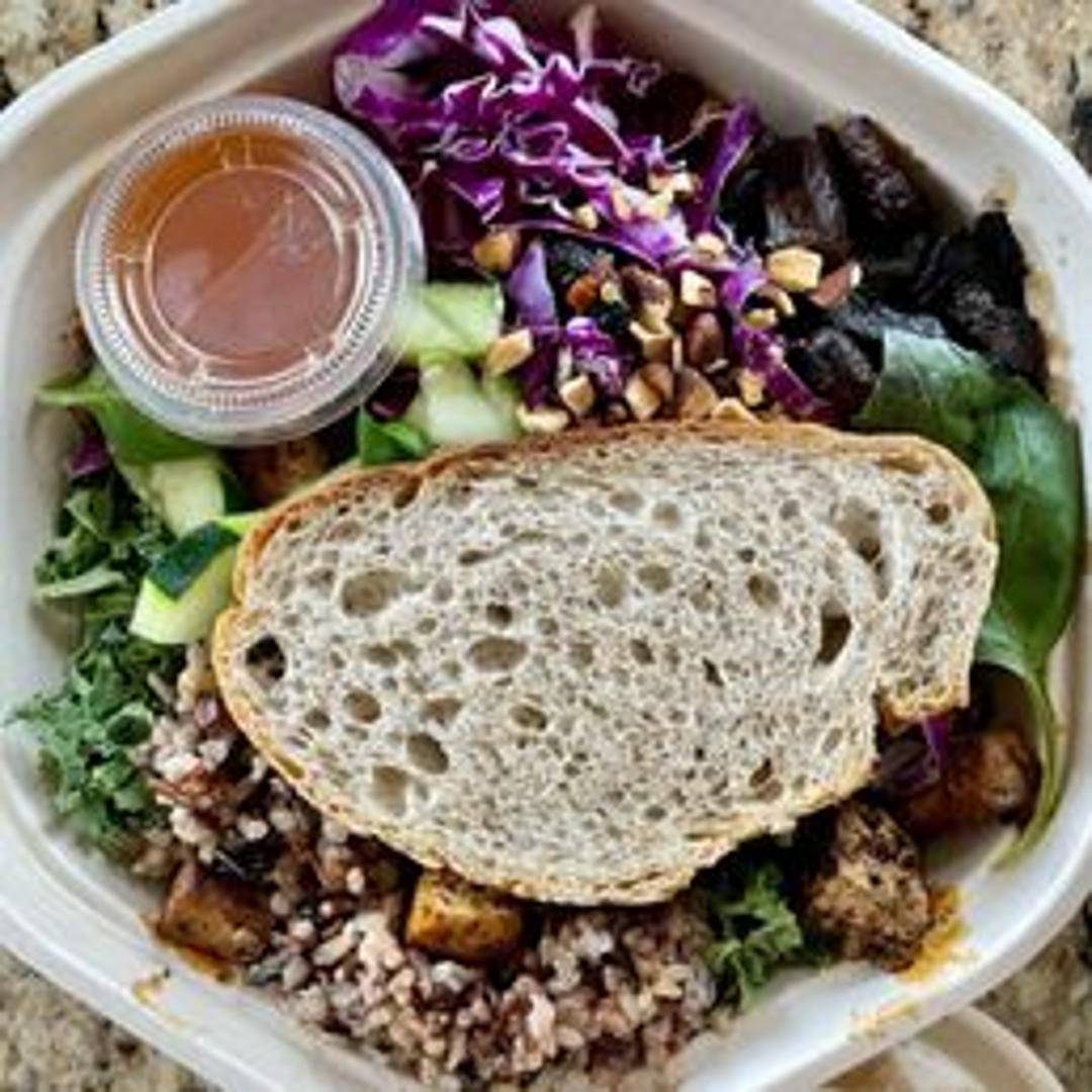 Warm quinoa, baby spinach, shredded kale, roasted sesame tofu, roasted portobellos, raw carrots, cucumbers, spicy broccoli, toasted sesame seeds, miso sesame ginger dressing. (Vegan, Gluten-Free)
