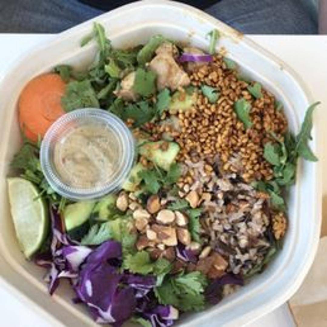 Warm wild rice, baby spinach, blackened chicken, crispy rice, raw carrots, cucumbers, shredded cabbage, cilantro, lime squeeze, spicy cashew dressing.