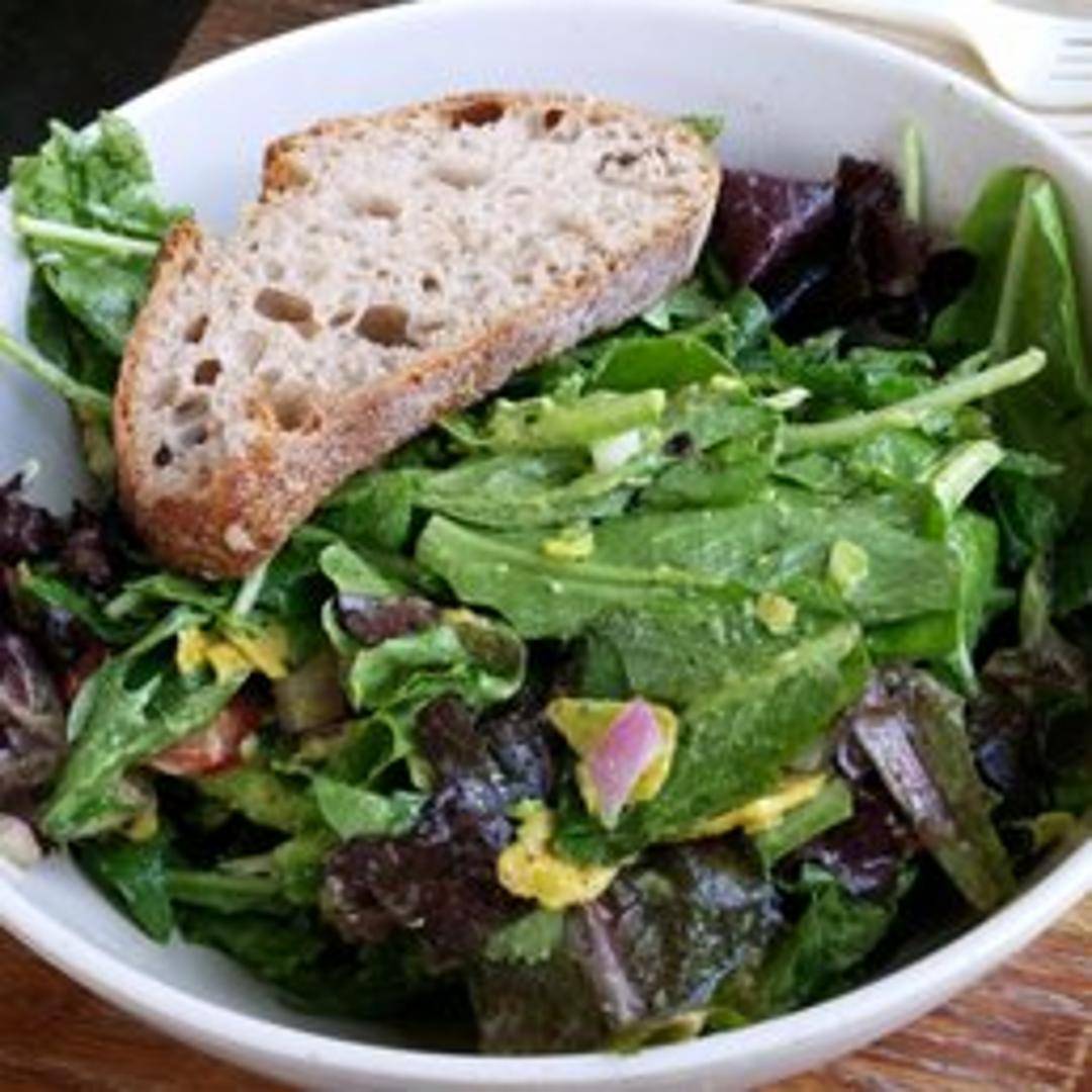 Organic mesclun, roasted chicken, avocado, grape tomatoes, red onion, tortilla chips, sweet lime dressing. A fresh and flavorful salad with a creamy guacamole kick.
