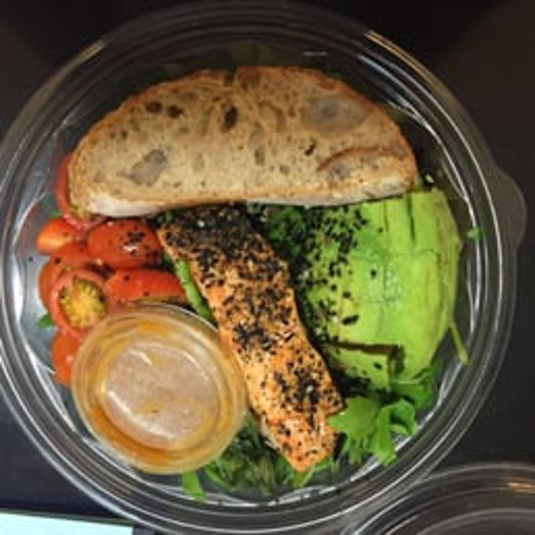 Organic spinach, shredded kale, raw carrots, raw beets, apples, cranberries, toasted pumpkin seeds, sunflower seeds, goat cheese, lemon tahini maple dressing.