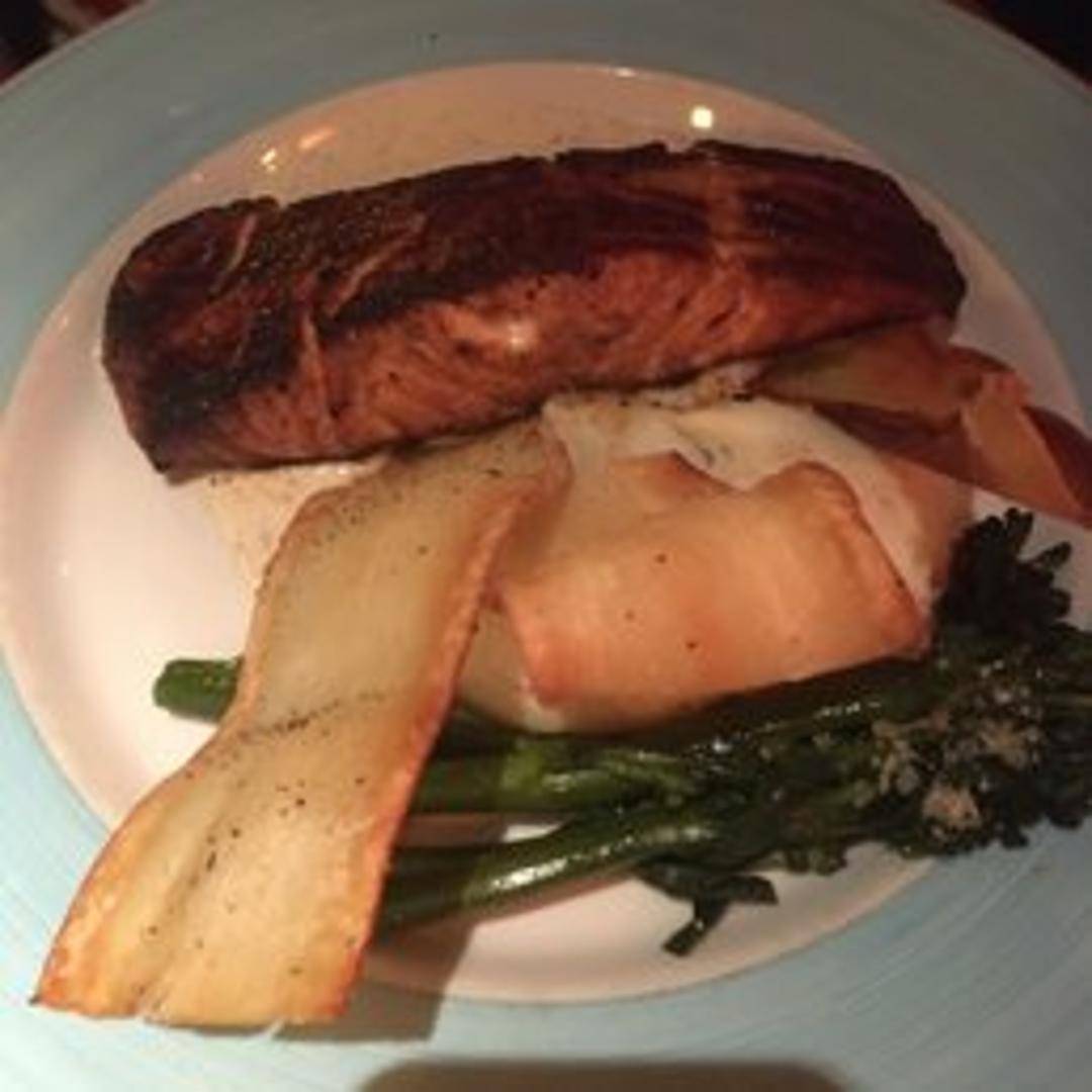 A succulent filet of salmon, lightly smoked to impart a delicate, smoky flavor while maintaining its moist and tender texture. This expertly prepared dish at Sweetwater Tavern highlights the natural richness of the salmon, often served as a main course with complementary side dishes that enhance its exquisite taste.