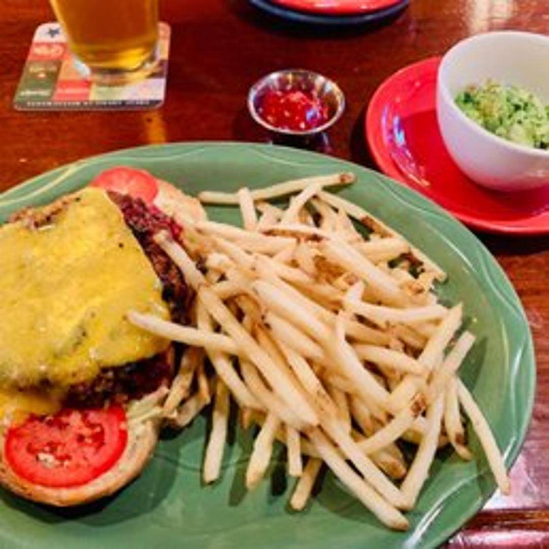 A satisfying and flavorful plant-based option, Sweetwater Tavern's Veggie Burger features a hearty patty crafted from a delicious blend of black beans, brown rice, and roasted vegetables. Expertly grilled and served on a toasted brioche bun, it comes dressed with crisp lettuce, ripe tomato, red onion, tangy pickles, and your choice of cheese, offering a wholesome and delicious alternative for any palate.