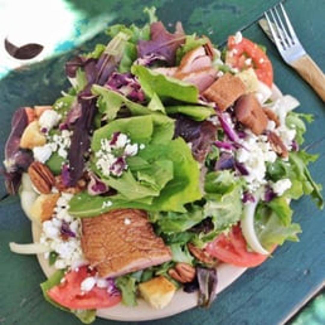 A flavorful salad featuring tender smoked duck breast, mixed greens, seasonal vegetables, and a tangy vinaigrette.