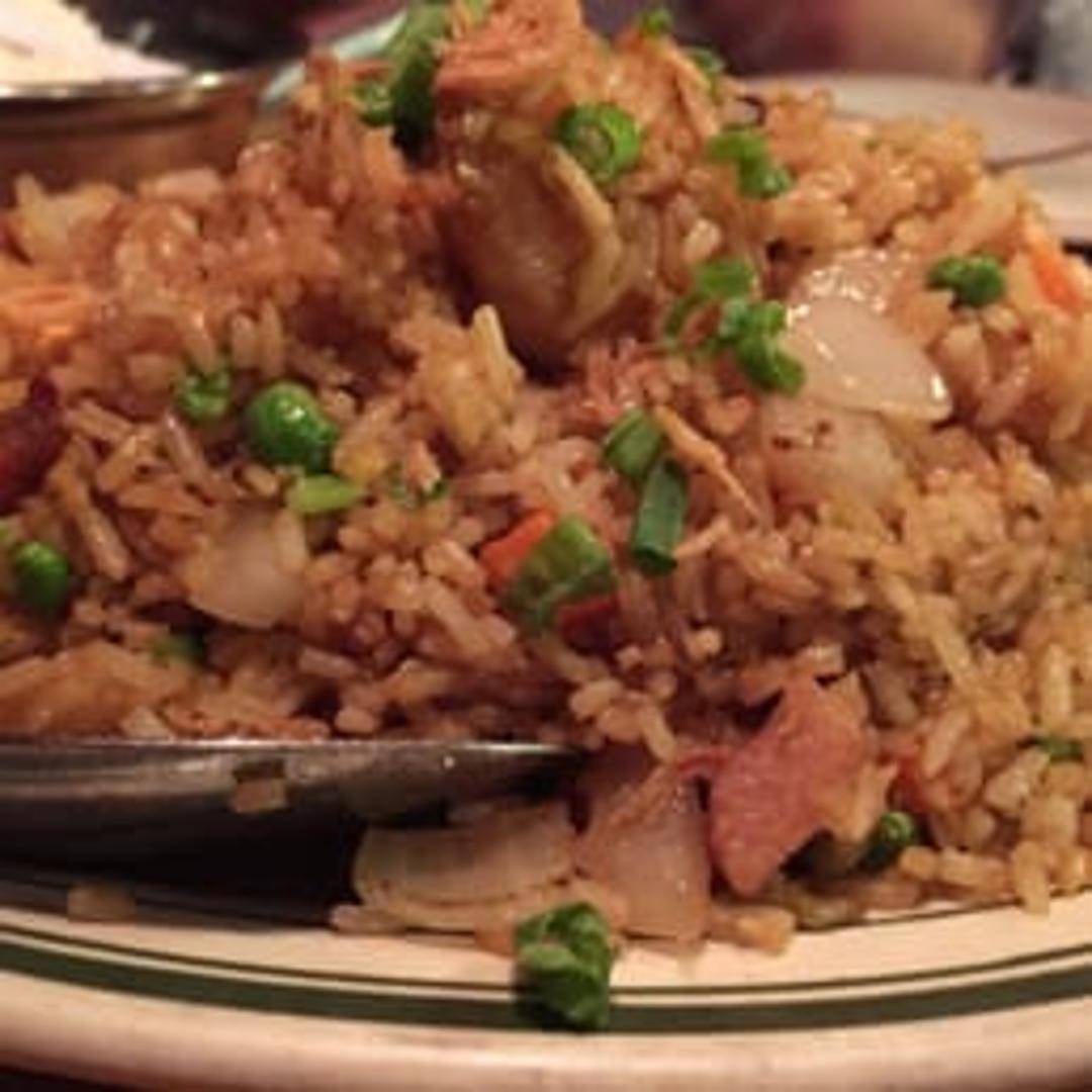 Fried rice with a mix of shrimp, chicken, pork, eggs, peas, carrots, and onions.