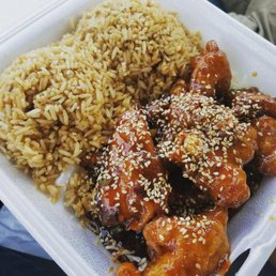 Crispy chicken pieces coated in a sweet sesame sauce, often with a hint of ginger and garlic. Served with steamed rice and sprinkled with sesame seeds.