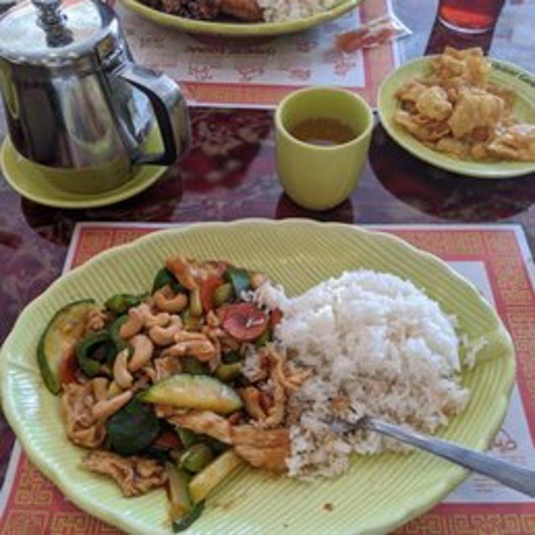 A classic and comforting dish featuring tender, diced chicken breast pieces stir-fried with crunchy roasted cashews, vibrant bell peppers, crisp carrots, and fresh mushrooms, all coated in a rich, savory, and slightly sweet brown sauce that perfectly complements the ingredients.