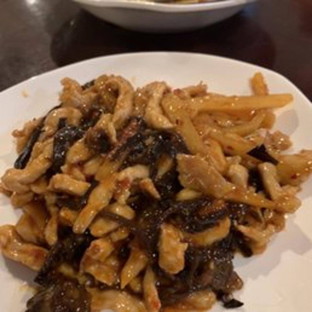 Delicately shredded pork, skillfully stir-fried with crisp bamboo shoots, tender wood ear mushrooms, and vibrant bell peppers, all coated in a classic Szechuan garlic sauce that perfectly balances sweet, sour, and spicy notes for a harmonious and flavorful dish.