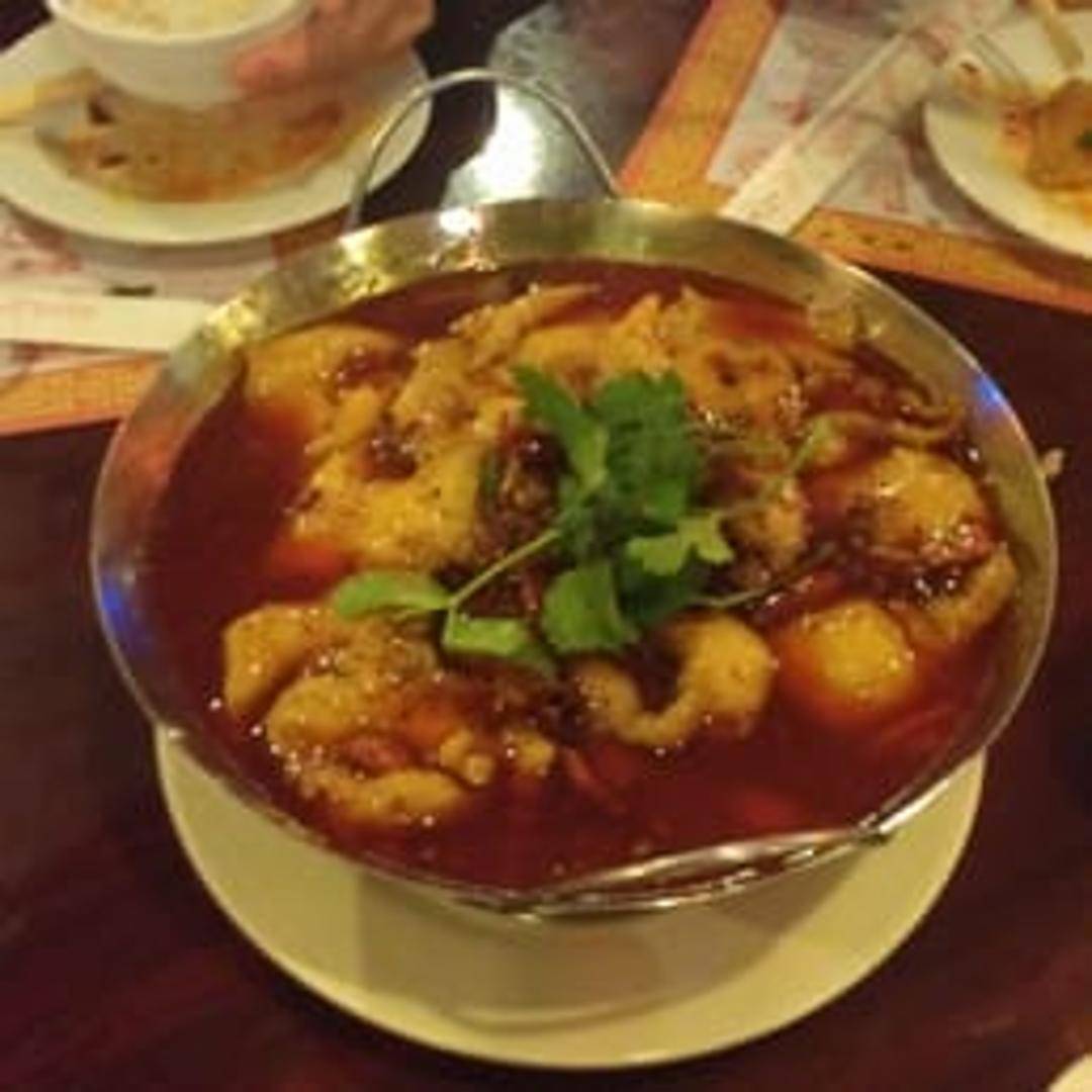 A quintessential Szechuan dish featuring delicate fish fillets expertly poached in a fiery red broth brimming with dried chilies, Szechuan peppercorns, garlic, and ginger. The dish is known for its intense spicy and numbing sensation, with hot oil poured over before serving to enhance its fragrant aroma.