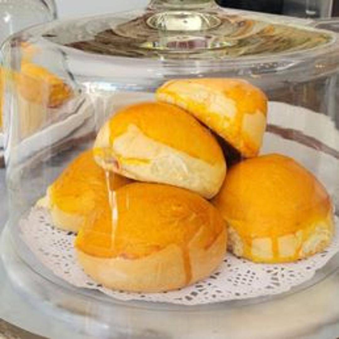 Soft, slightly sweet buns filled with a smooth, rich egg custard. The custard is baked inside the bun, creating a creamy, comforting center with a delicate, eggy flavor.