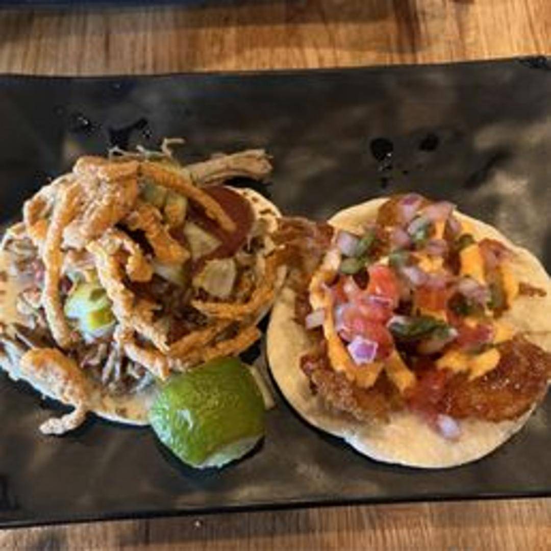 Crispy fried shrimp tossed in a spicy dynamite sauce, topped with shredded cabbage and a drizzle of cilantro-lime crema on a flour tortilla.