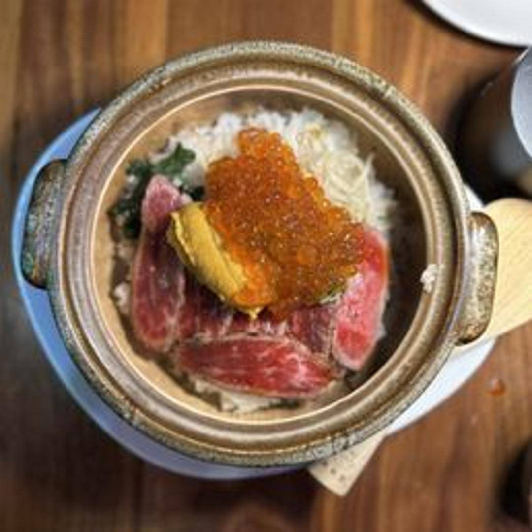A Japanese hot pot (Donabe) featuring thinly sliced beef (Gyu) cooked in a flavorful broth. The Donabe is likely served in a communal pot, allowing diners to cook the beef and other ingredients directly at the table. Expect a savory and comforting experience with additions like vegetables, tofu, and mushrooms that infuse the broth with umami. Served with dipping sauces.