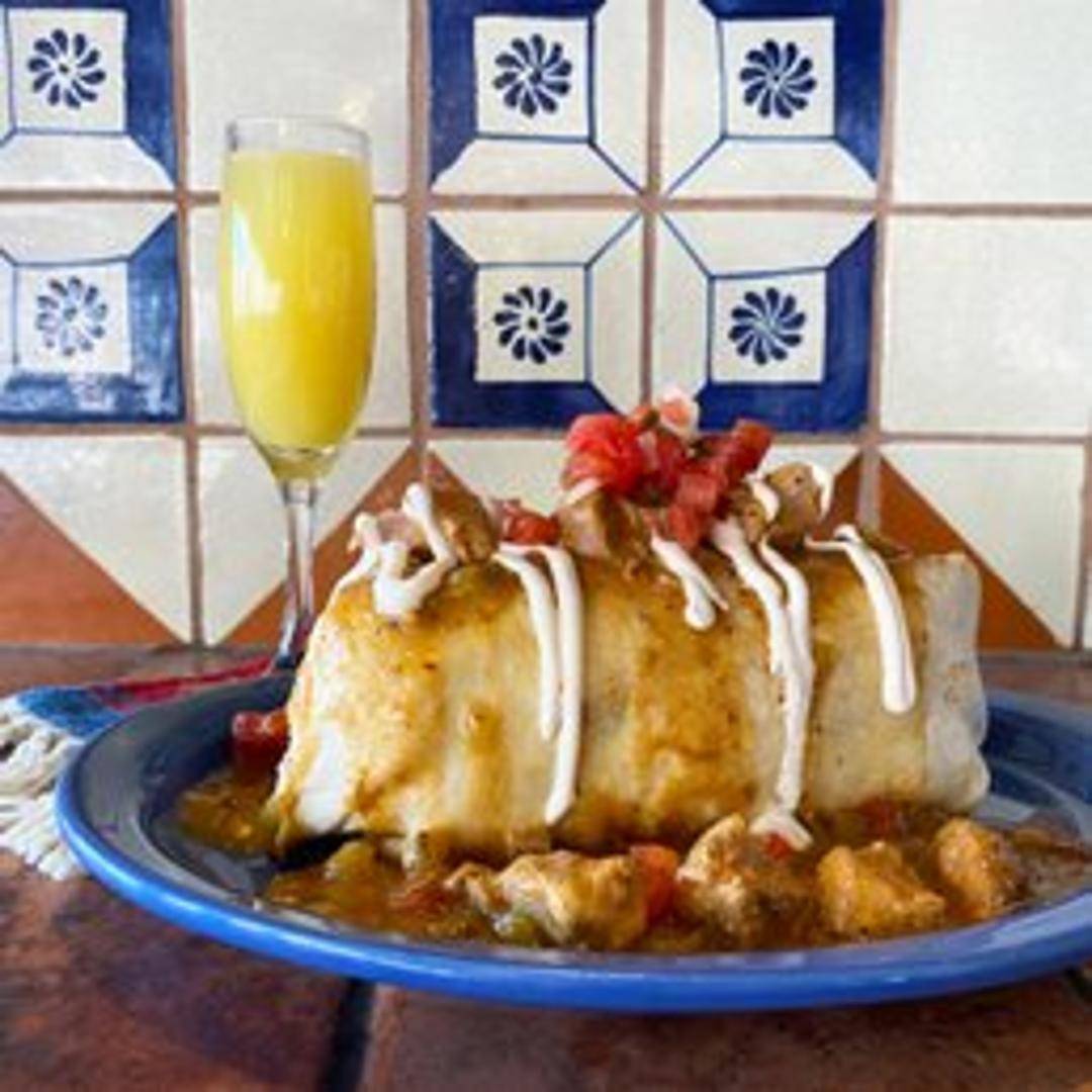 A large flour tortilla filled with scrambled eggs, your choice of meat (bacon, sausage, or chorizo), potatoes, cheese, and green chili.