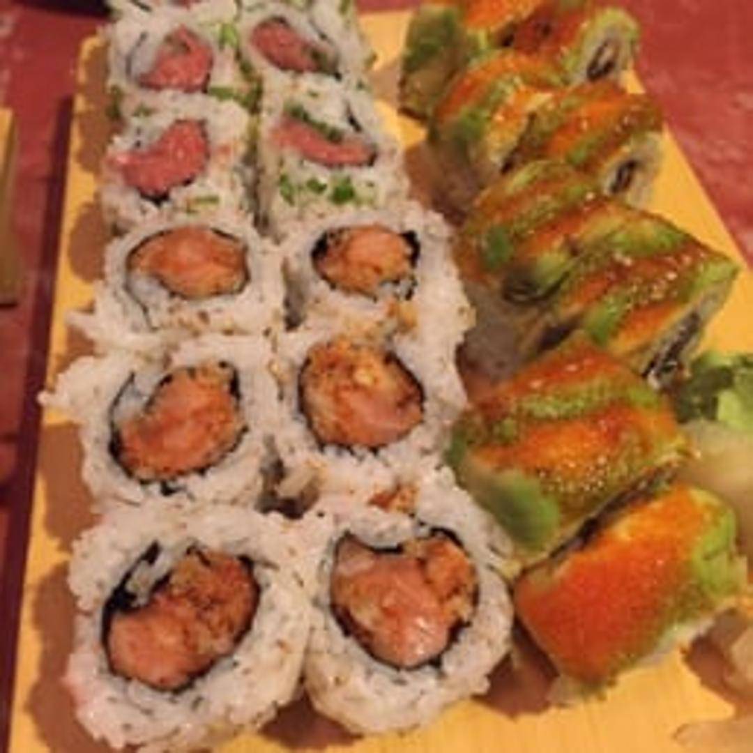 A visually striking and popular sushi roll, typically crafted with a core of tempura-fried shrimp or grilled unagi (eel). It's elegantly topped with thinly sliced avocado, resembling dragon scales, and often drizzled with sweet eel sauce or spicy mayonnaise, offering a delightful combination of textures and flavors.