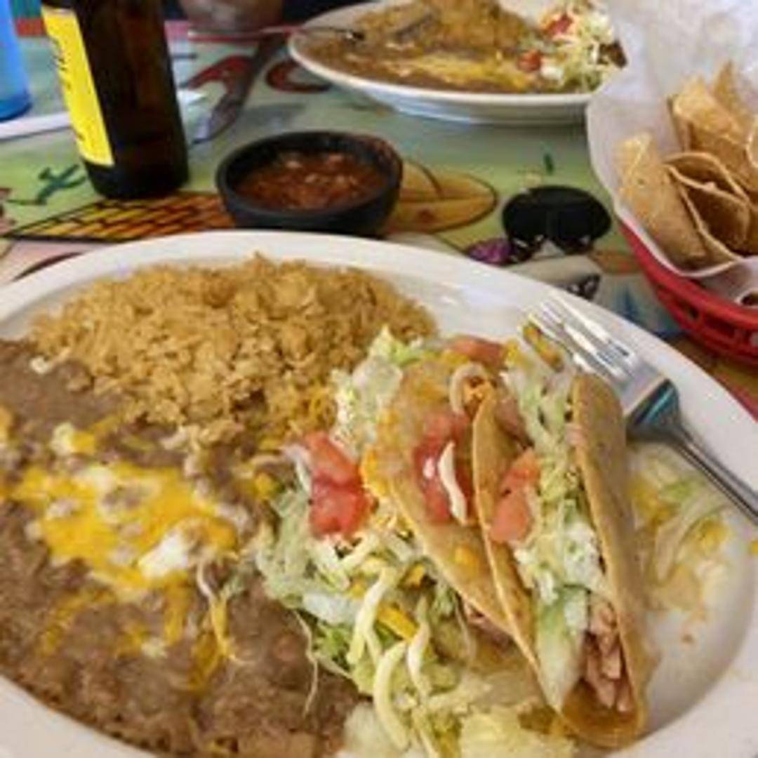 Three crispy corn tortilla tacos filled with seasoned shredded chicken. Served with a side of rice and beans, topped with lettuce, cheese, and your choice of salsa.