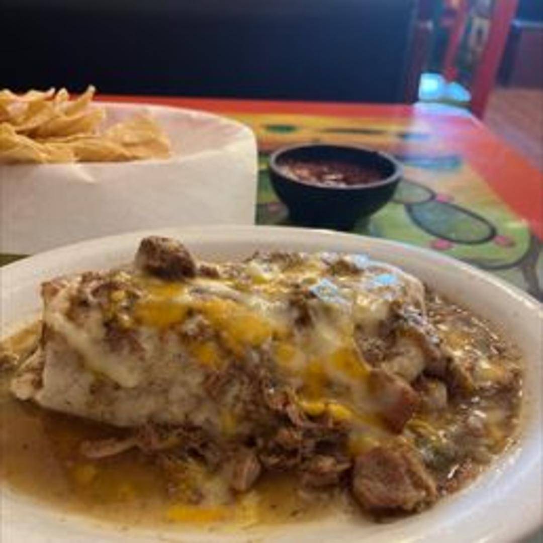 Two corn tortillas filled with your choice of cheese, chicken or pork, smothered in a tangy and mildly spicy chili verde sauce. Topped with melted cheese and served with rice and beans.