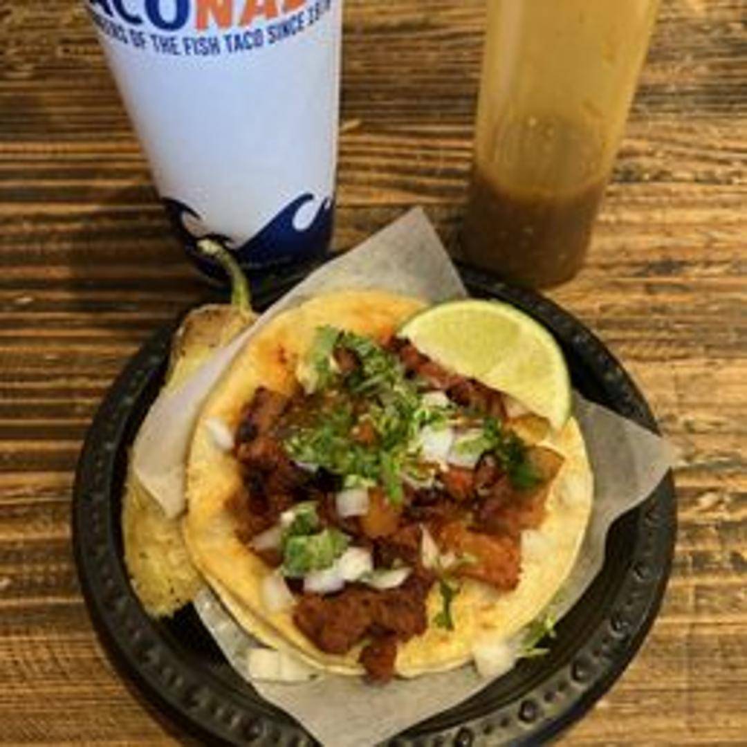 A corn tortilla filled with marinated and grilled pork (al pastor), onions, cilantro, and a slice of pineapple. Served with salsa.