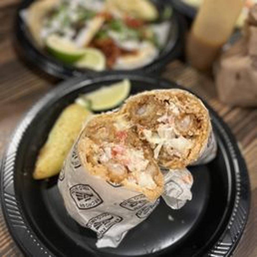 A large flour tortilla filled with grilled or sautéed shrimp, rice, cabbage, pico de gallo, and a creamy sauce.