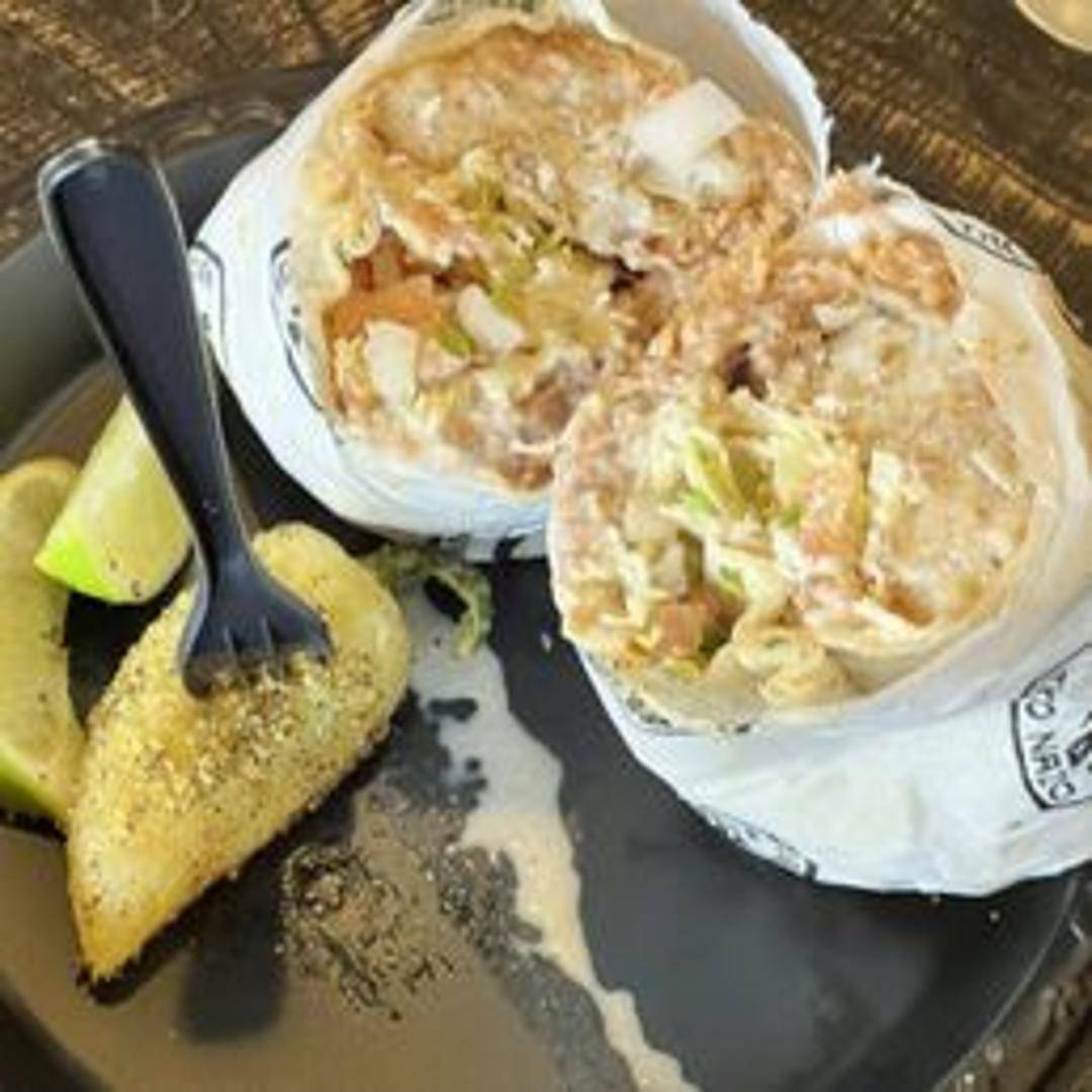 A large flour tortilla filled with grilled or battered fish, rice, cabbage, pico de gallo, and a creamy sauce.