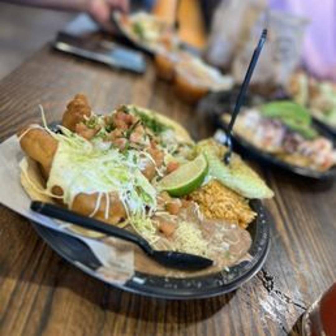 Three crispy, deep-fried tacos filled with seasoned ground beef or shredded chicken. Topped with lettuce, cheese, and your choice of salsa. Includes a side of rice and beans.