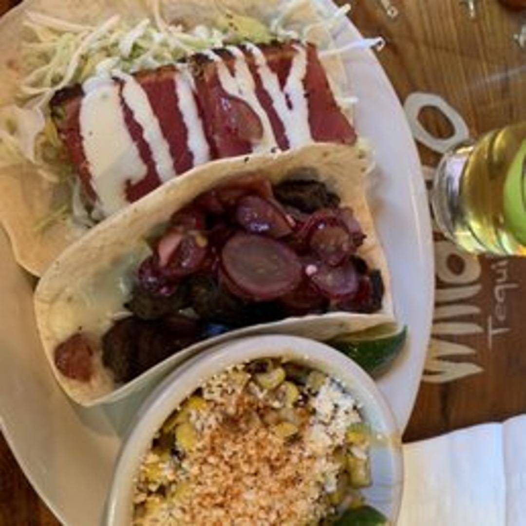 Seared, sushi-grade tuna served in a warm flour tortilla. Topped with shredded cabbage, guacamole, pickled red onions, and a spicy sesame aioli.