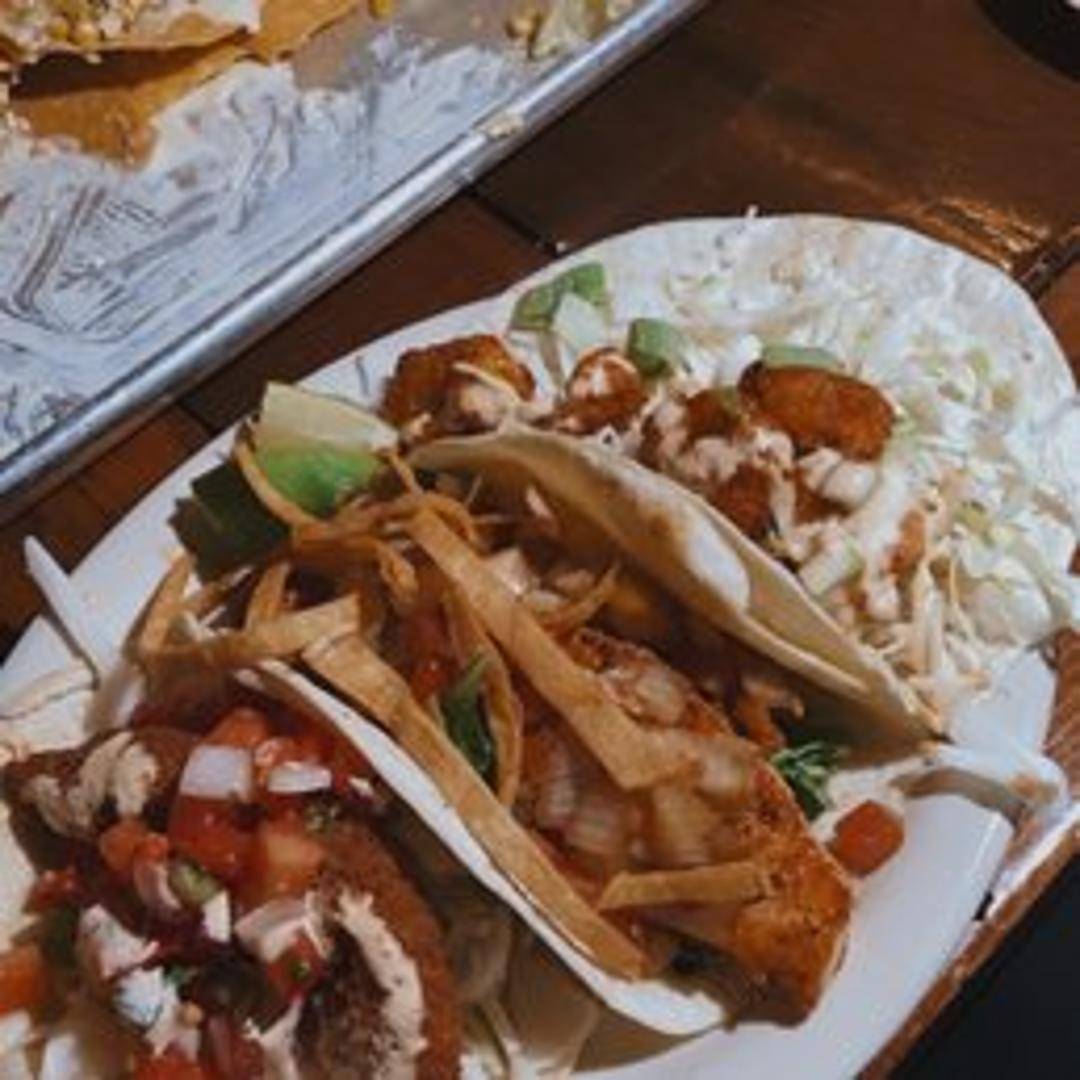 Crispy battered or fried white fish served on a warm corn or flour tortilla. Usually topped with shredded cabbage, pico de gallo, and a creamy Baja sauce. Availability of toppings may vary.