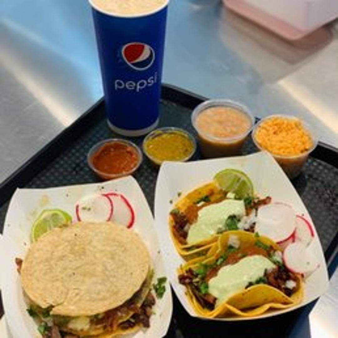 A combination plate featuring a selection of tacos. Options and quantities may vary. Includes a choice of meat, tortillas, and toppings. Served with rice and beans.