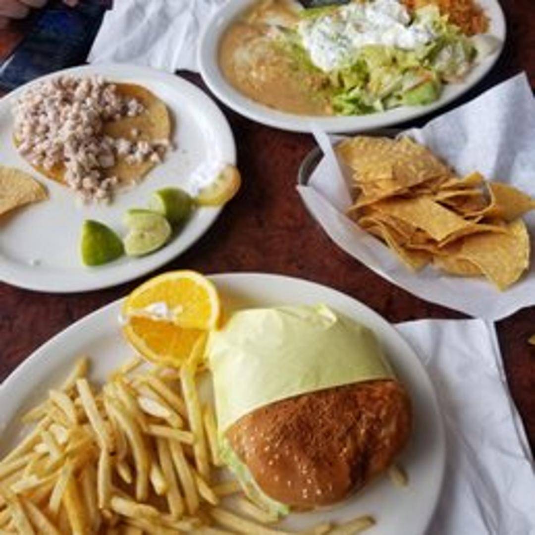 Two corn tortillas filled with shredded chicken, covered in enchilada sauce and melted cheese. Served with rice and beans. Can be served with your choice of fillings and toppings.